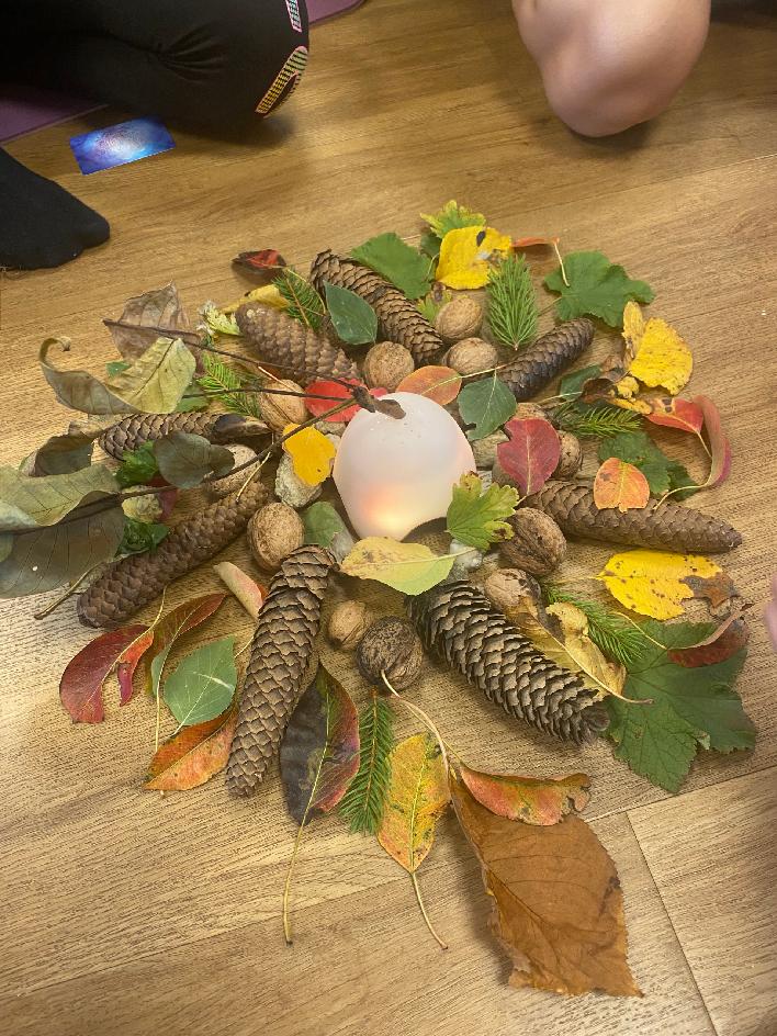 podzimní mandalu – děti kladou přírodniny do kruhu podle barev,