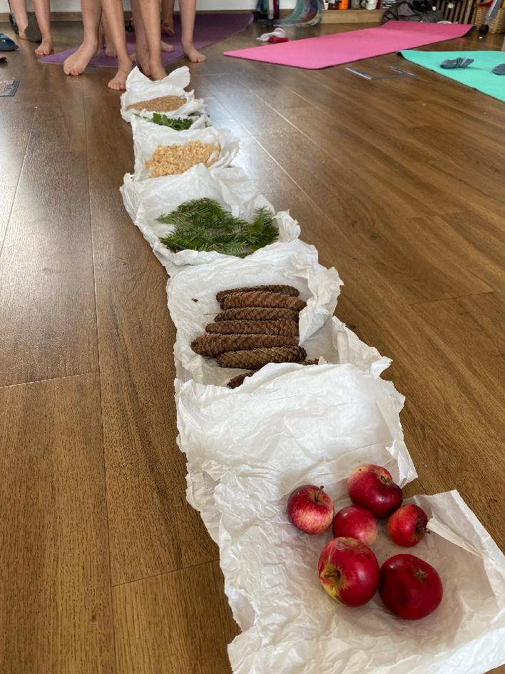 smyslovou stezku – rozlož šišky, kamínky, mech, látky a bosky po nich přecházejte,