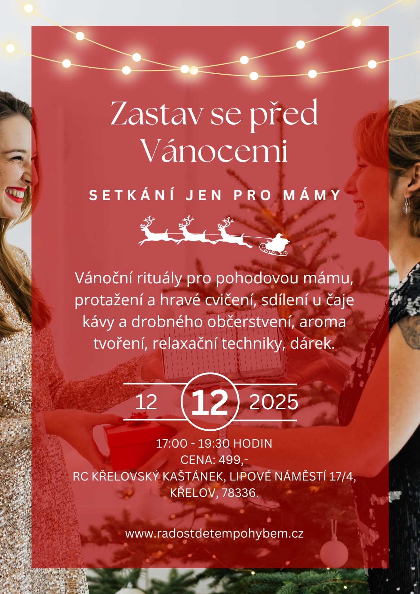 Předvánoční akce se uskuteční v Křelově, v rodinném centru Křelovský Kaštánek. V němž na vás bude čekat útulný prostor, vyhřívaný krbovými kamny, doprovázený vůní z esenciálních olejů a příjemnou atmosférou.